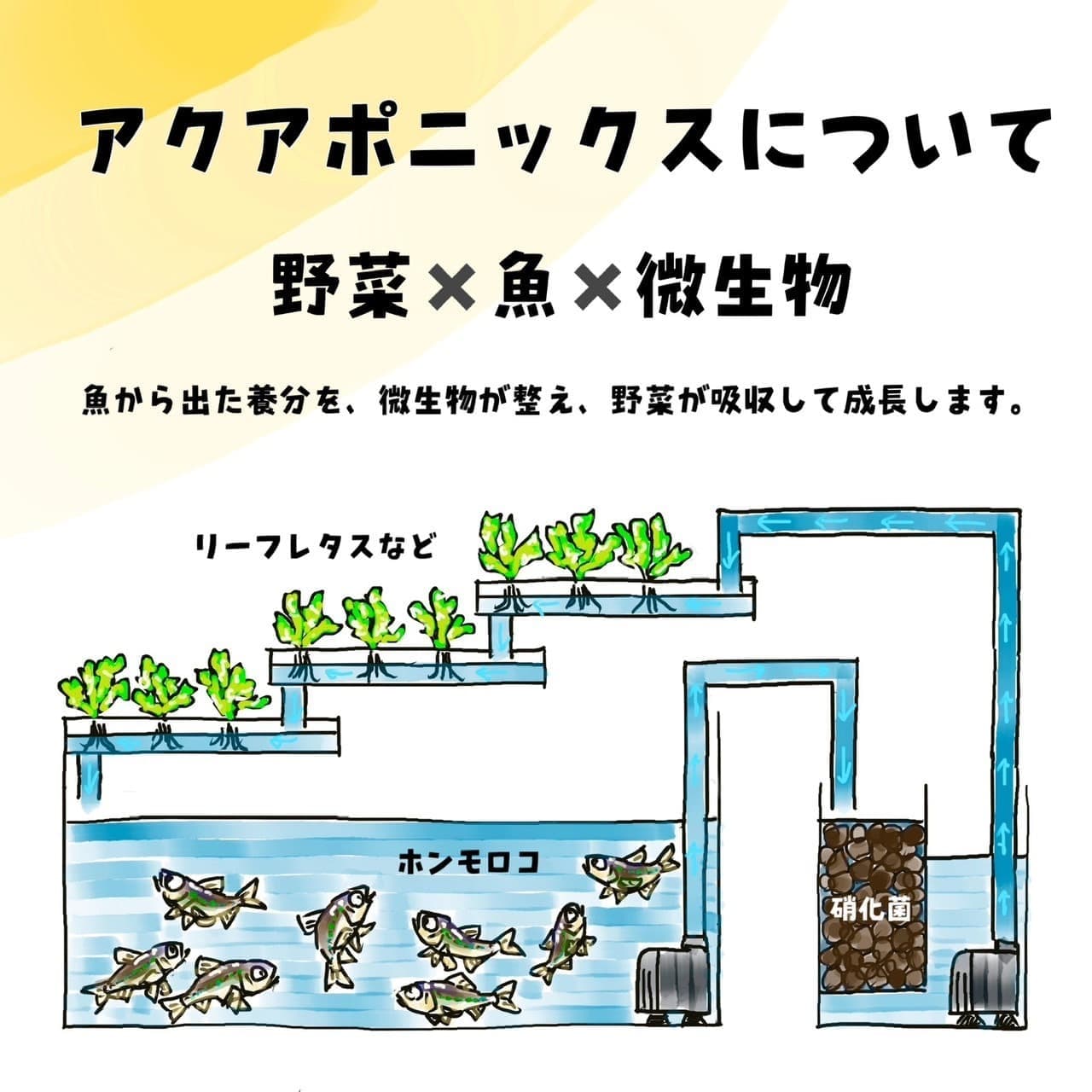 魚(ホンモロコ)と野菜(リーフレタスなど)、そして微生物が支え合うアクアポニックスの仕組みを示した図です。魚の排泄物を硝化菌が分解し、野菜が養分として吸収。浄化された水が再び魚に戻る、循環型の生態系農業です。