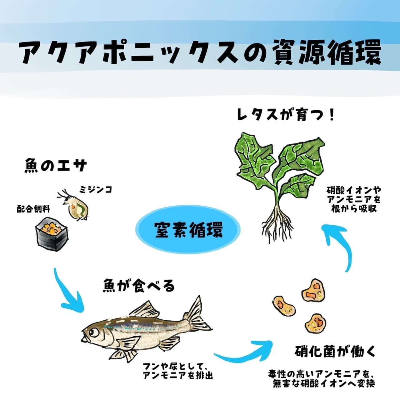 魚に与えたエサが体内を通って排泄され、アンモニアとして水中に放出されます。硝化菌がそれを無害な硝酸イオンへ変換し、植物(レタス)が根から吸収。浄化された水が再び魚へ戻る、窒素を循環させるアクアポニックスの資源循環が根幹となります。